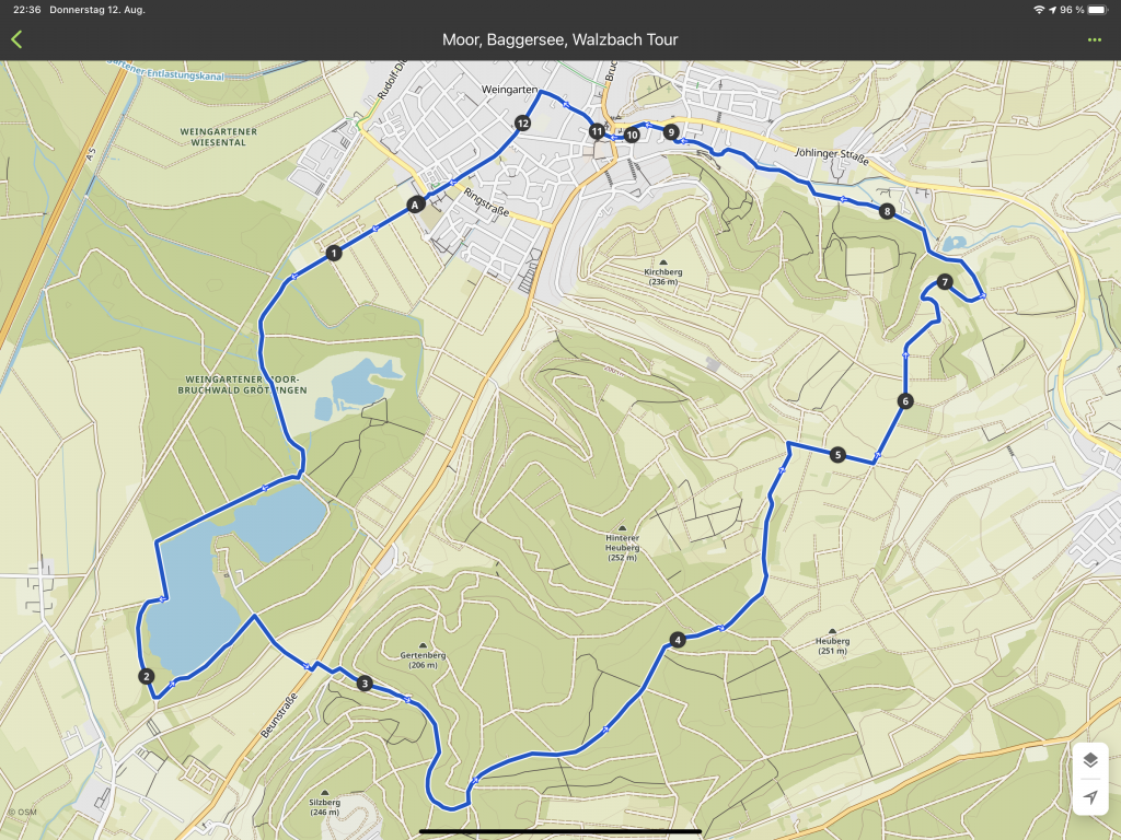Bin geschafft nach 14 km Wanderung durch das Weingartner Moor, um den Grötzinger Baggersee und durchs Walzbachtal zurück nach Weingarten. Eine schöne Tour mit drei früheren KollegINNen und einem tollem Abschluss am Marktplatz im Stilbruch.